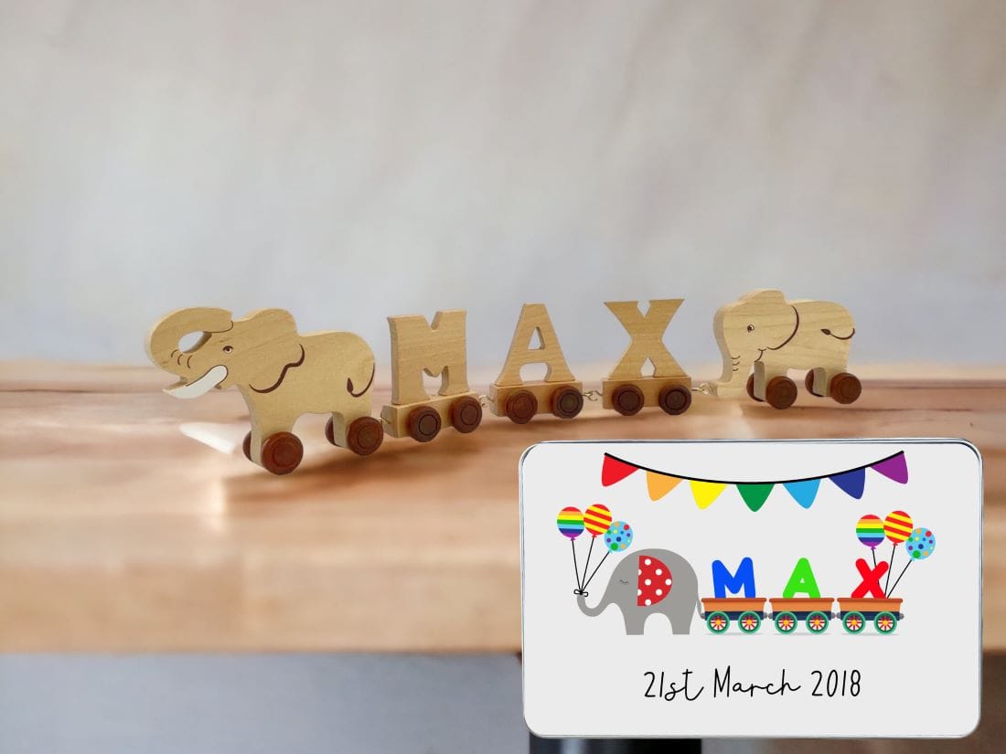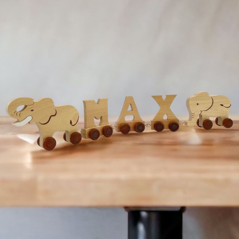 Our popular elephant wooden name train. Make any name or message with the letters, which are pulled along by an adorable elephant.