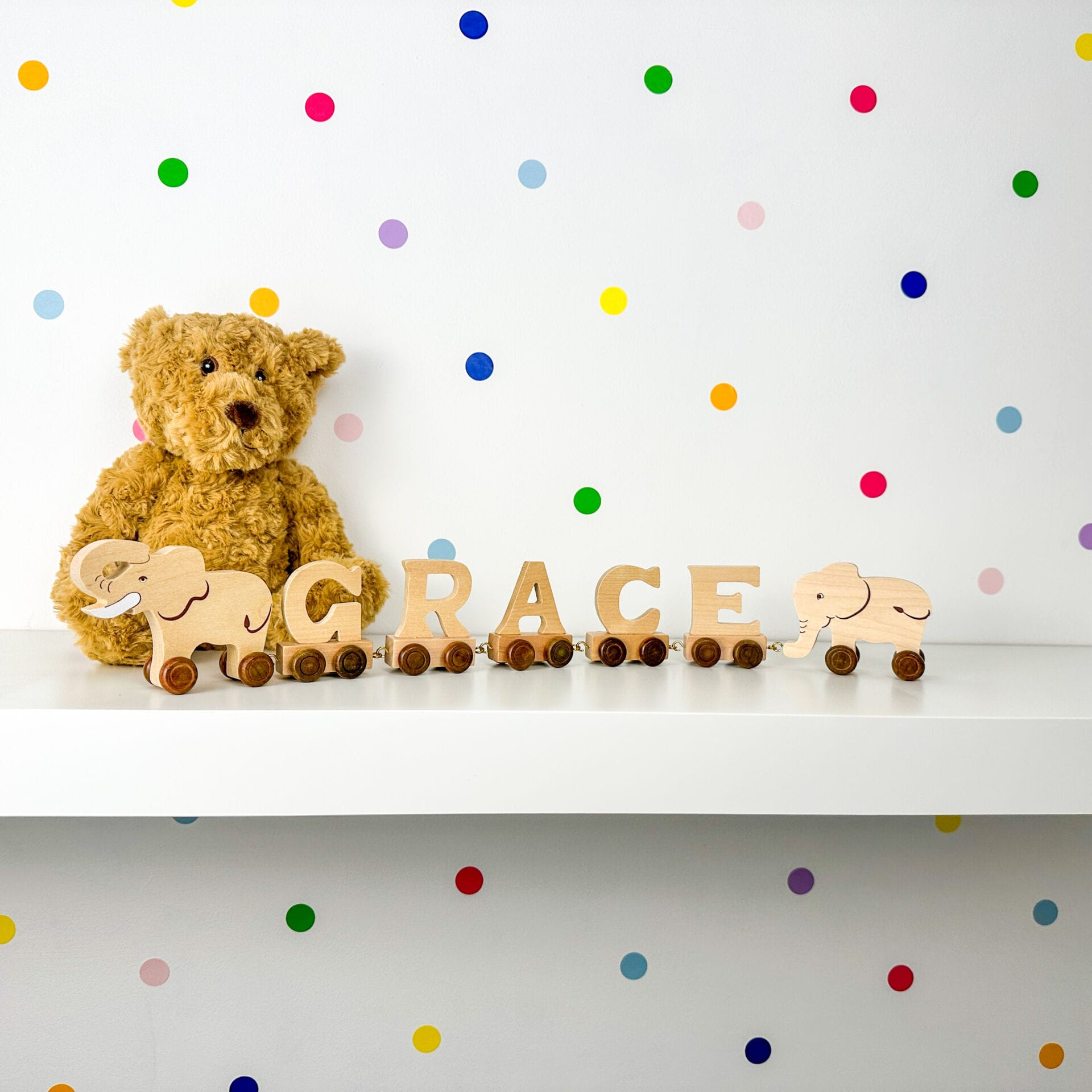 Our personalised elephant wooden name train, from Ryan Town Toys makes the perfect gift. Use the individual wooden letters to make any name or message. From a delightful addition to a nursery to a fun decoration at a wedding, these trains are a unique gift idea for all occasions.