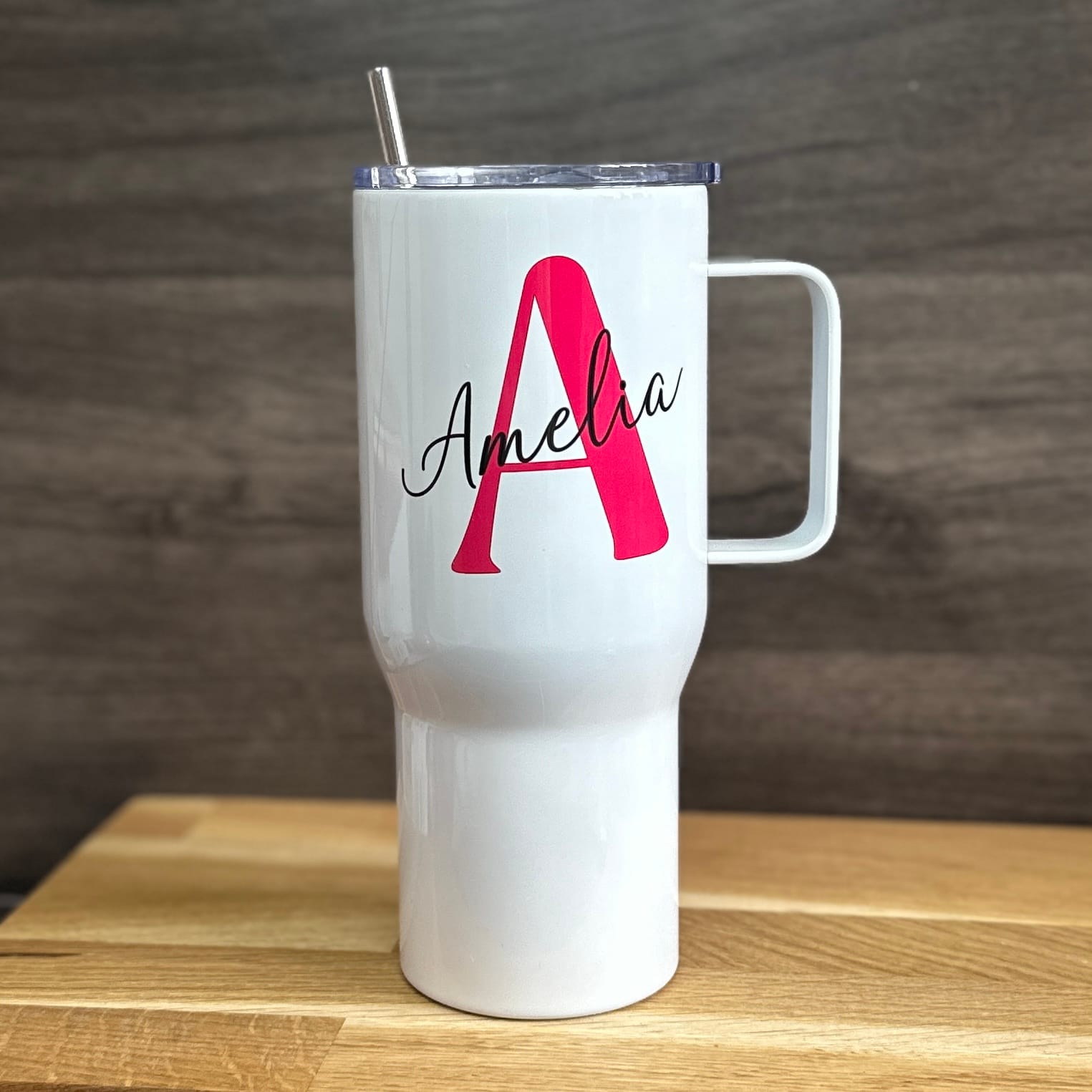 Monogram initial travel mug which can be personalised with any name of your choice (up to 15 characters). Available in a choice of 15 colours.