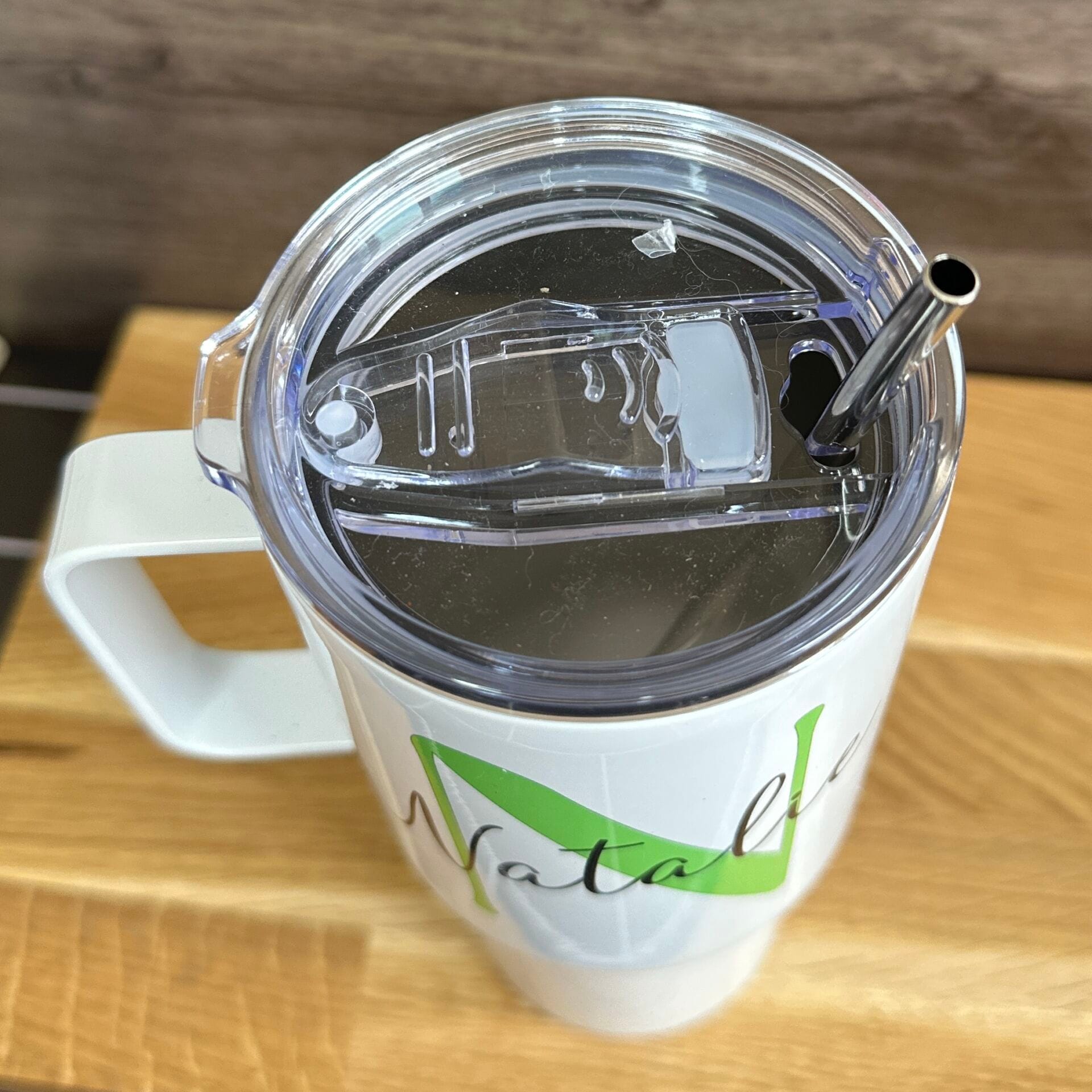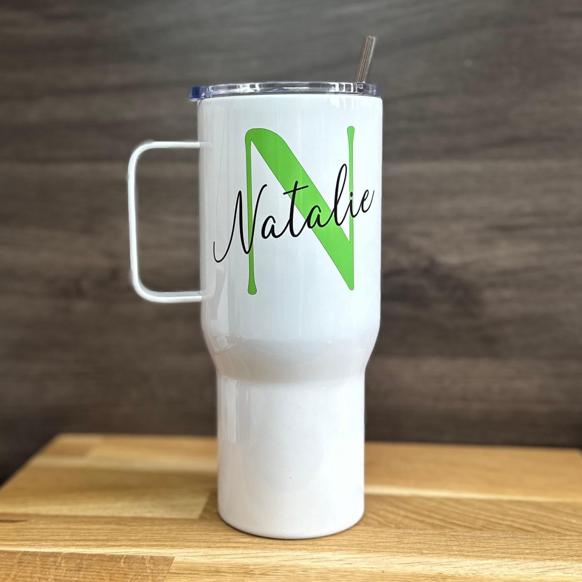Monogram initial travel mug which can be personalised with a monogram inital in your chosen colour and the name (max. 15 characters) written across in black. This product is made from stainless steel and its double walled constructions ensures optimal insulation, keeping drinks cold for an extended period. It can also be used to keep drinks warm, but it is not recommended for boiling hot water as the pressure from the heat may cause the lid to lift. Each mug/tumbler comes with a clear flat lid which has a slider feature so that you can drink directly from it. It also has a hole for the supplied stainless steel straw. The mug is printed in house here at Me & My Friend using dye sublimation printing.