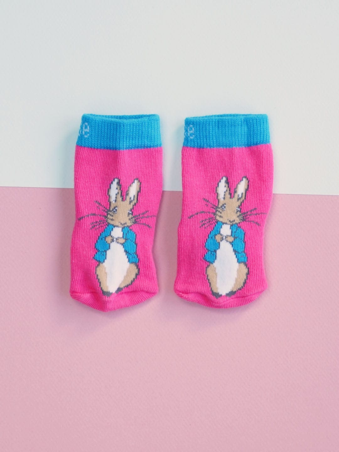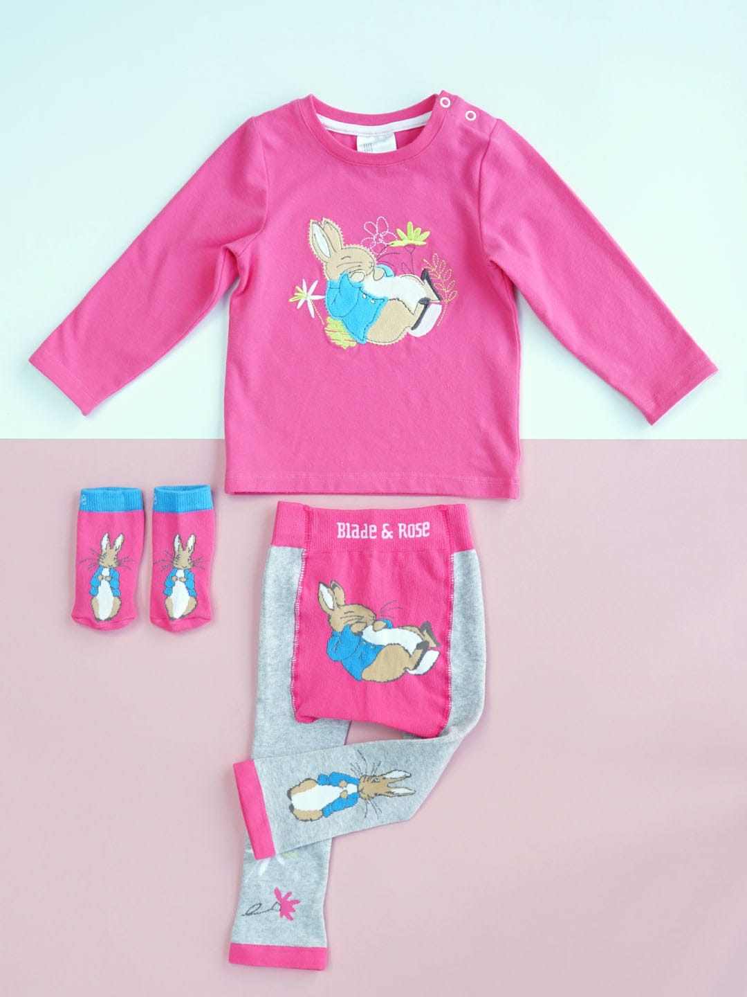 Peter Rabbit Pink socks from popular UK brand, Blade & Rose. Pink socks with a Peter Rabbit on the feet. Matching leggings and top available.