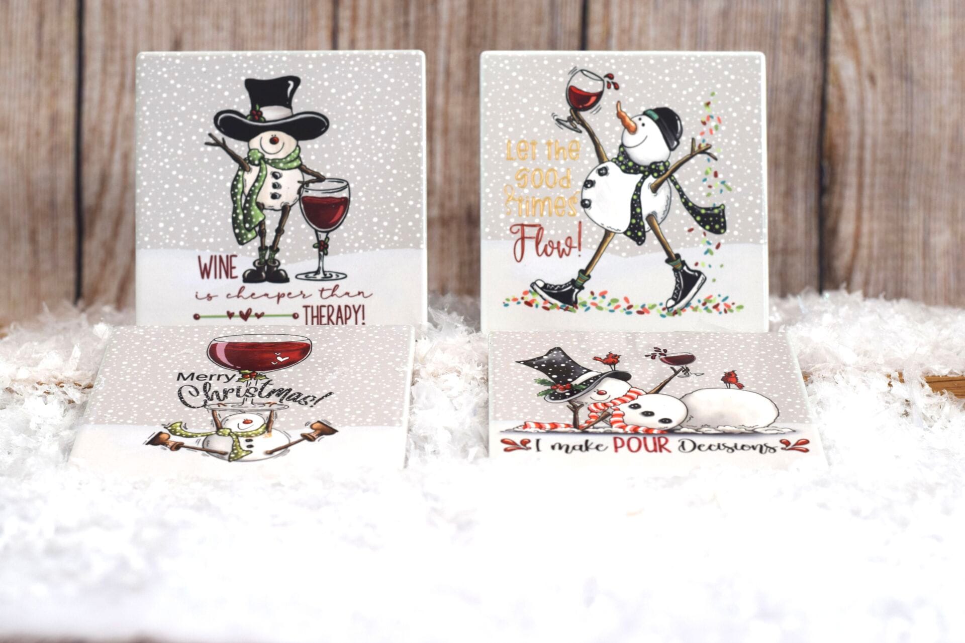 Set of 4 snowman coasters, each featuring a different amusing snowman design.
