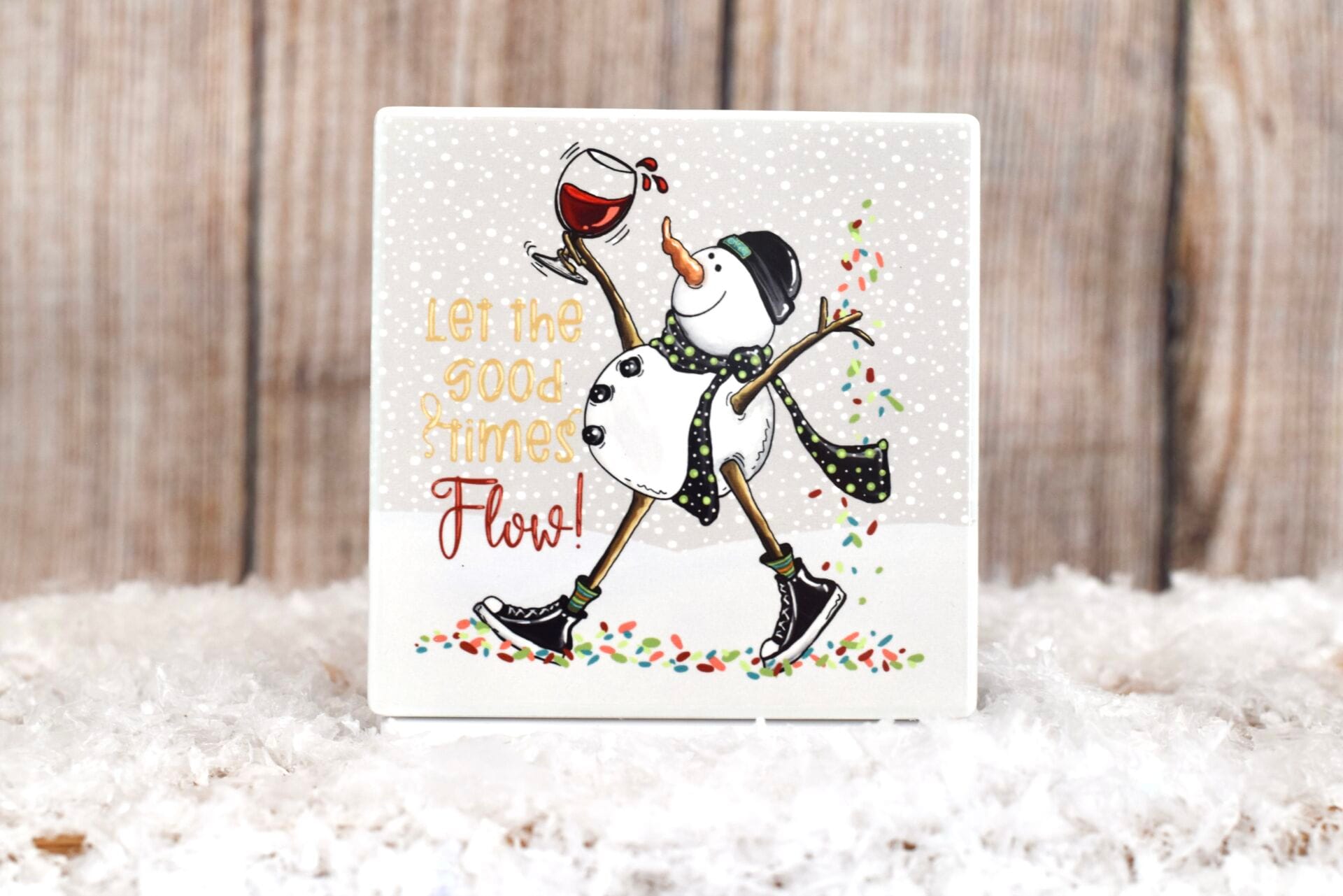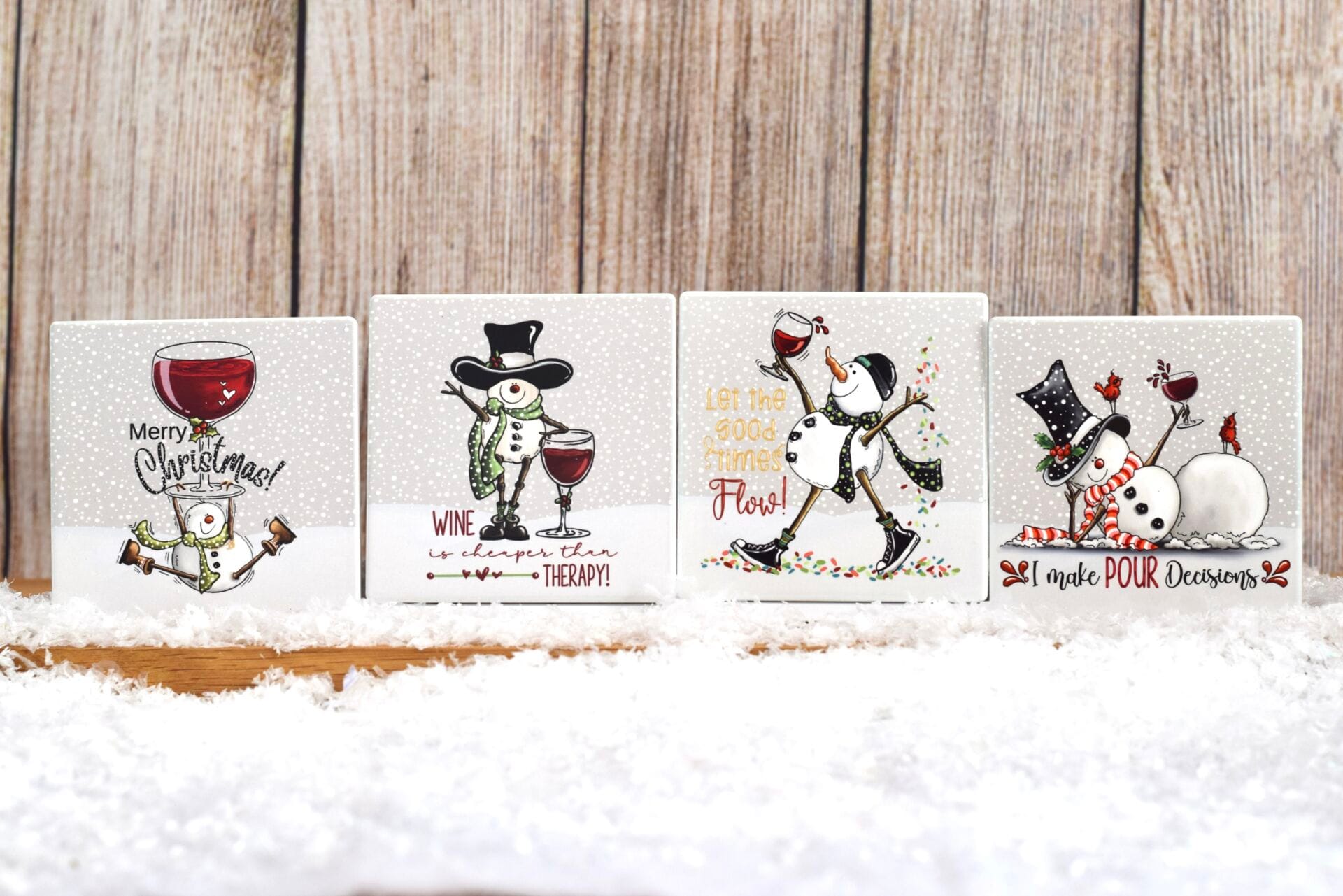 Set of 4 ceramic snowman coasters, each featuring a different amusing snowman design. Perfect addition to any Christmas table!